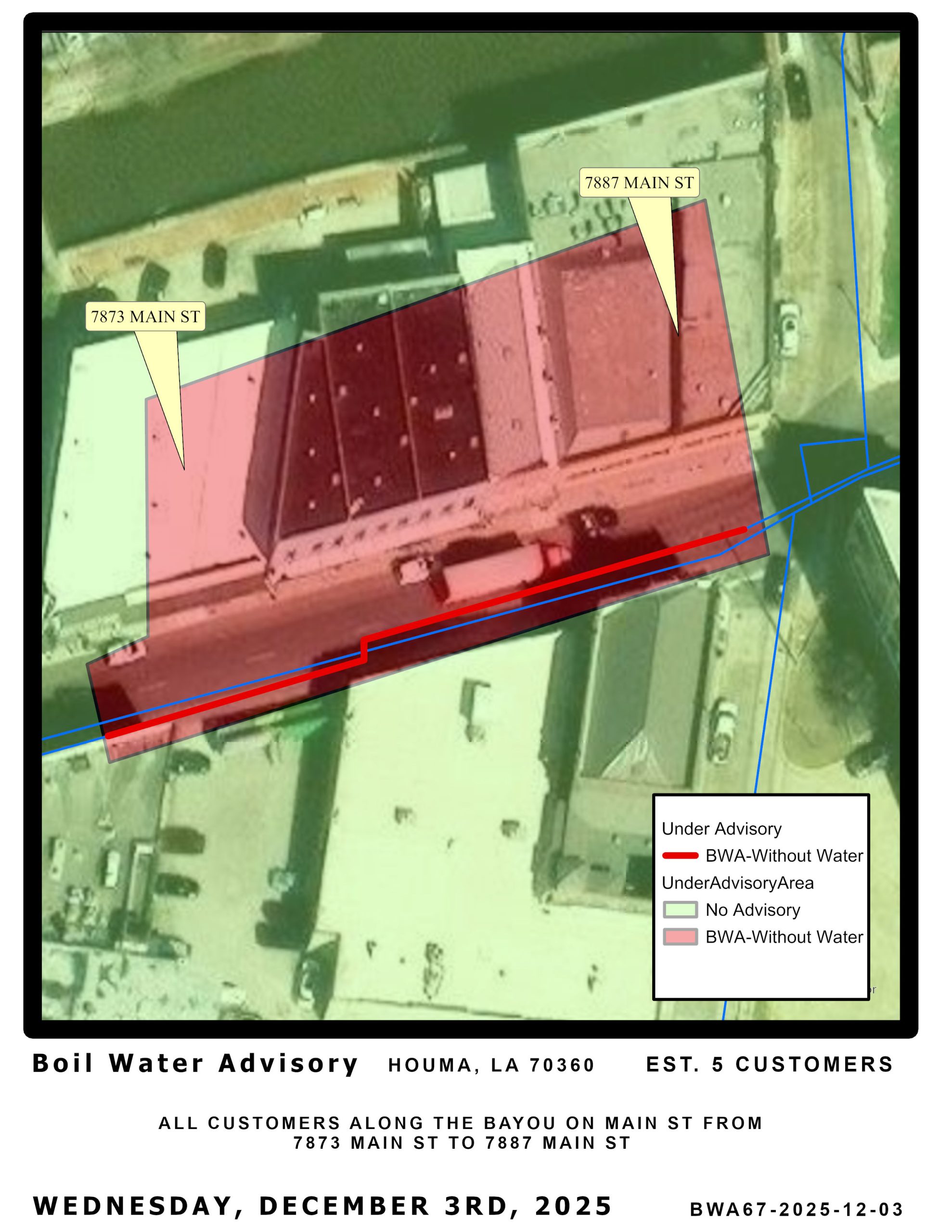 Repairs to the main line in this area caused the pressure to drop below 20 PSI, therefore we are issuing a BOIL WATER ADVISORY for all customers along the bayou on Main St from 7873 Main St to 7887 Main St.