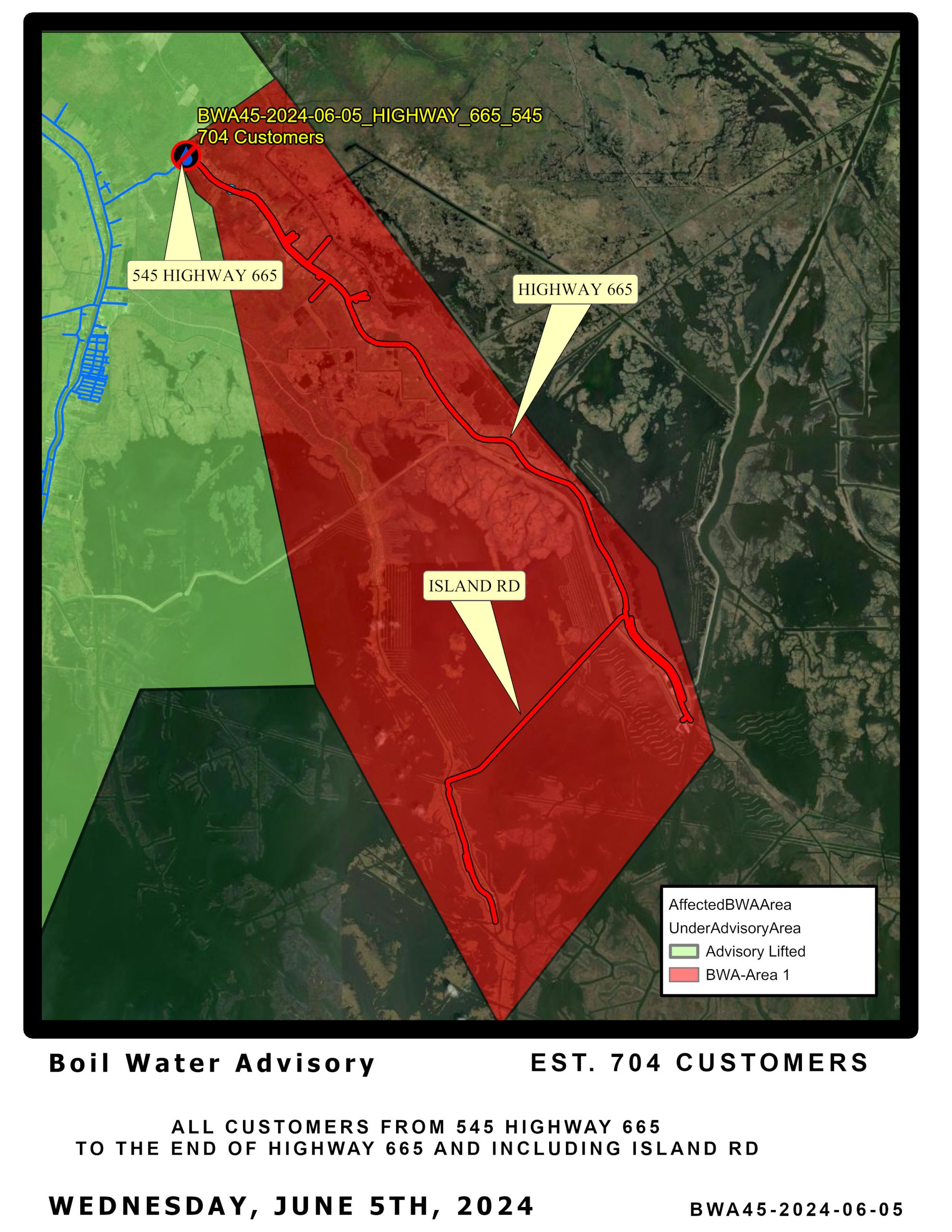 Maintenance work done in this area caused the pressure to drop below 20 PSI, therefore we are issuing a BOIL WATER ADVISORY for All Customers From 545 Hwy 665 To The End of Hwy 665 and Including Island Road.
