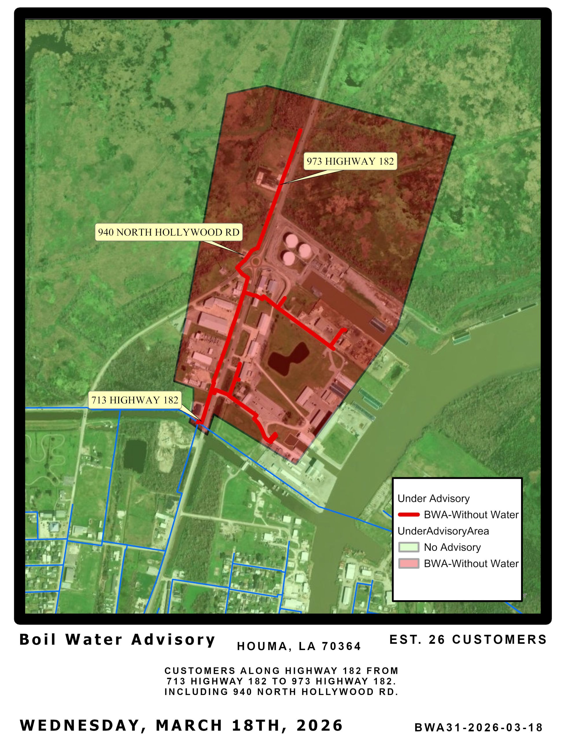Repairs to a main line in this area caused the pressure to drop below 20 PSI, therefore we are issuing a BOIL WATER ADVISORY for Customers along Highway 182 from 713 to 973 Highway 182, Including 940 North Hollywood Rd.