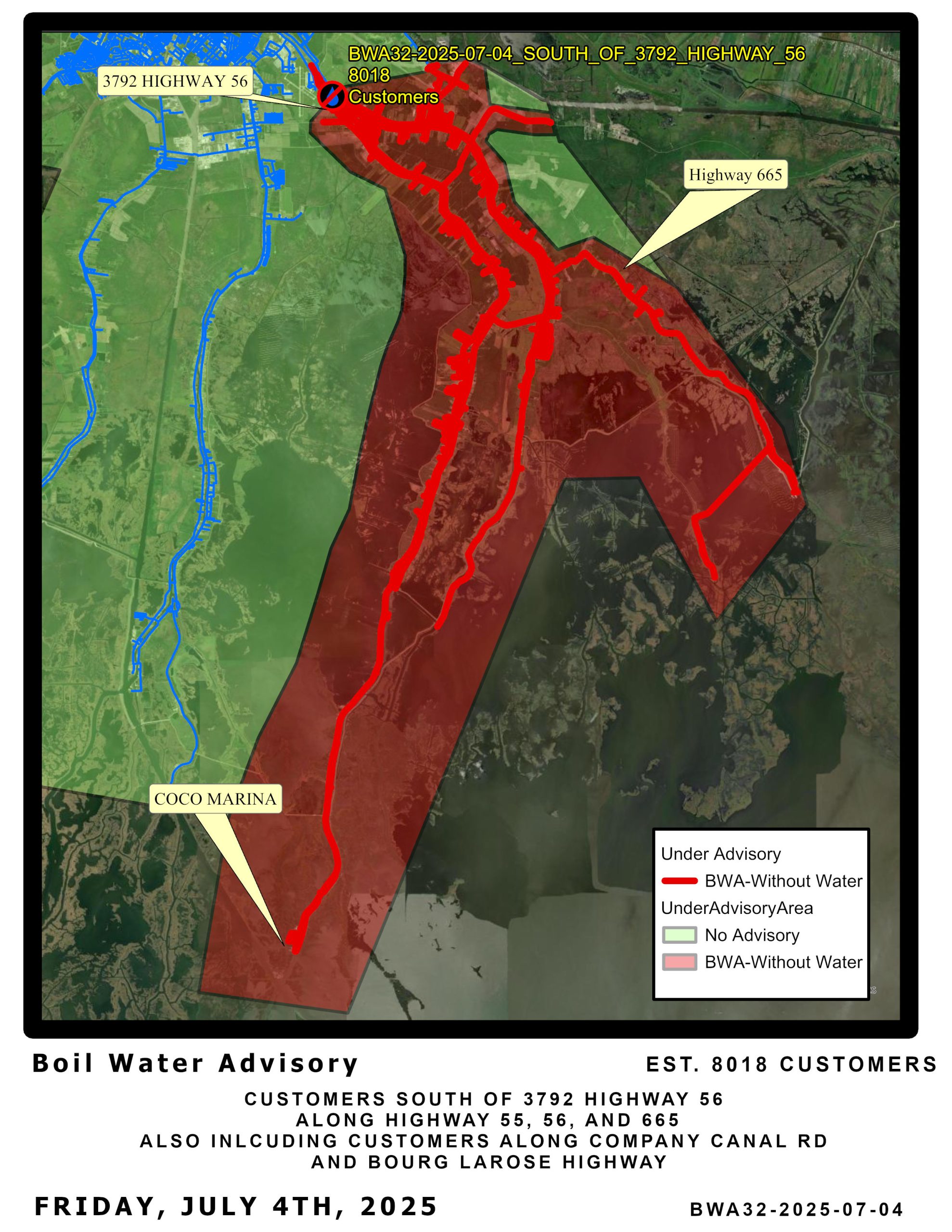 A leak in this area has caused the pressure to drop below 20 PSI, therefore we are issuing a BOIL WATER ADVISORY for CUSTOMERS SOUTH OF 3792 HIGHWAY 56 ALONG HIGHWAY 55, 56, AND 665, INCLUDING CUSTOMERS ALONG COMPANY CANAL RD AND BOURG LAROSE HIGHWAY.